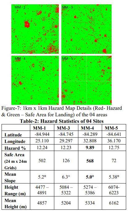 根据这一份文件显示,印度在月球寻找了4个潜在的着陆点,其中标注为MM-1、MM-3 、MM-4 、MM-5 4个着陆点,其中通过分析结果显示MM-4 是最有利的任务执行着陆点,所以,这可能也算是确定了。